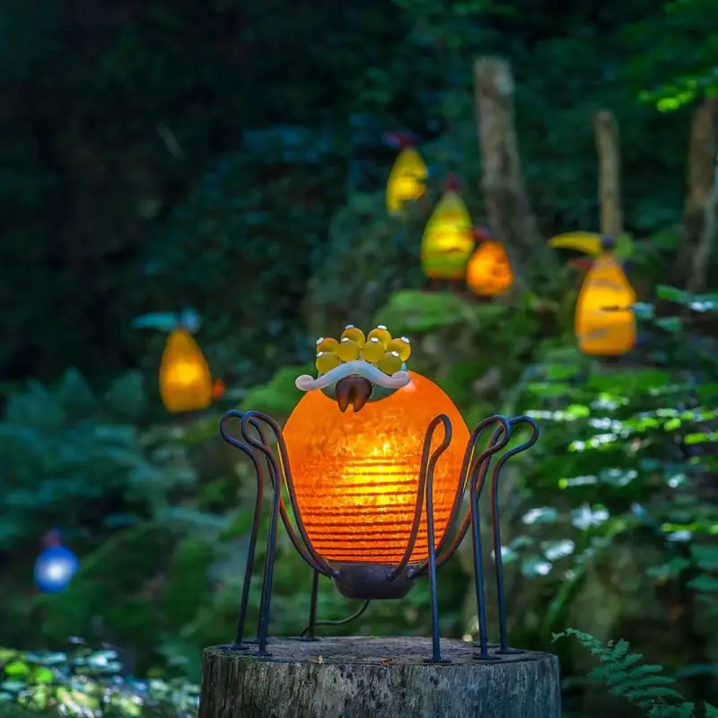 De glaskunstenaars hebben een buitengewoon object gecreëerd dat de gruwel van de spinnensoort wegneemt. Ze lijkt onconventioneel, zeer waardig, maar zeker niet eng. Een nieuwe exotische vriend in je tuin, hij zal je belonen met zijn warme, gekleurde licht.