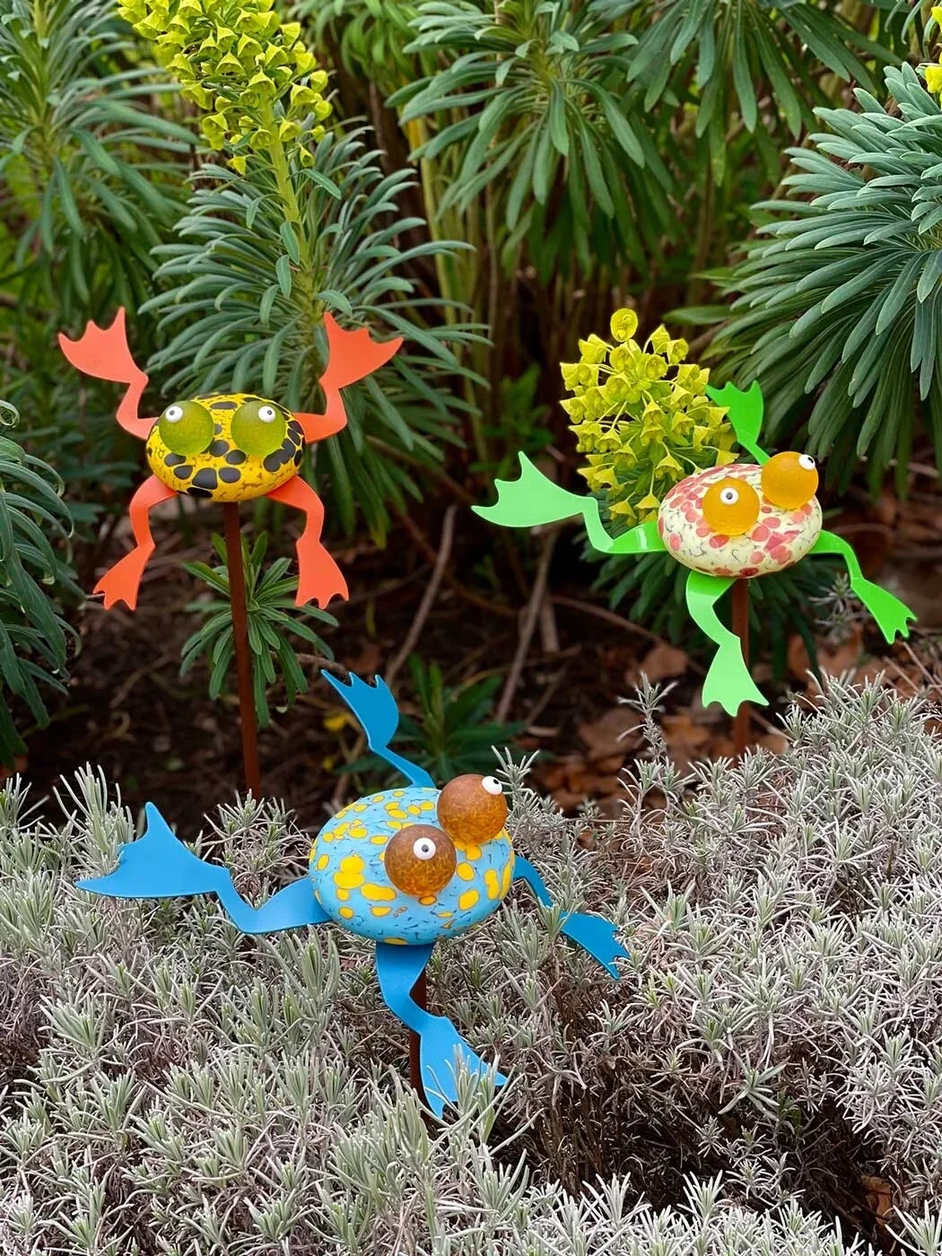 De kikkers kunnen worden bevestigd aan een 70 cm lange, gepoedercoate, bruine massief metalen staaf. Alle metalen onderdelen zijn gegalvaniseerd.